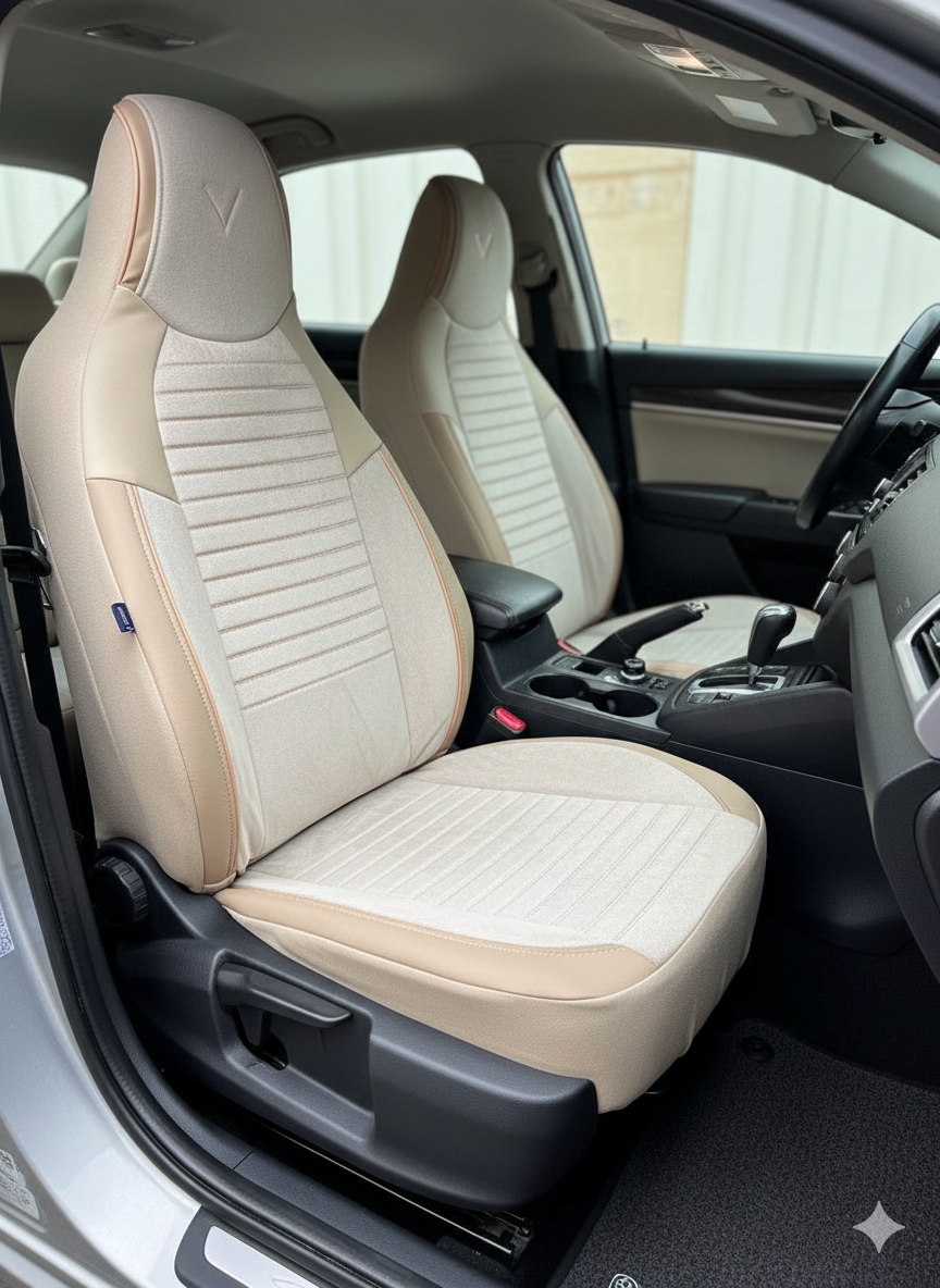 Sport Serisi, otomobil iç mekanınıza şıklık ve konfor katmak için tasarlanmış, bej Babyface kumaş ve deri koltuk kılıfı ve başlığı ile karşınızda! Aracınızı kişiselleştirirken, aynı zamanda konforunuzu en üst seviyeye çıkaracak bu tam set, sizler için özenle üretildi.